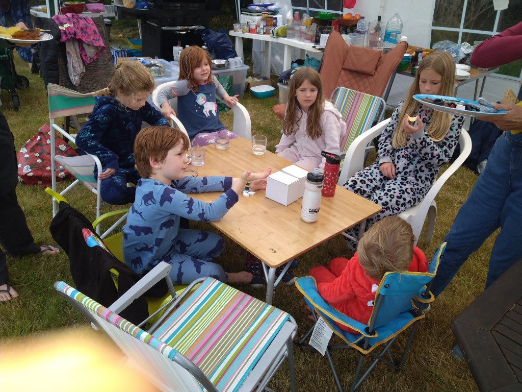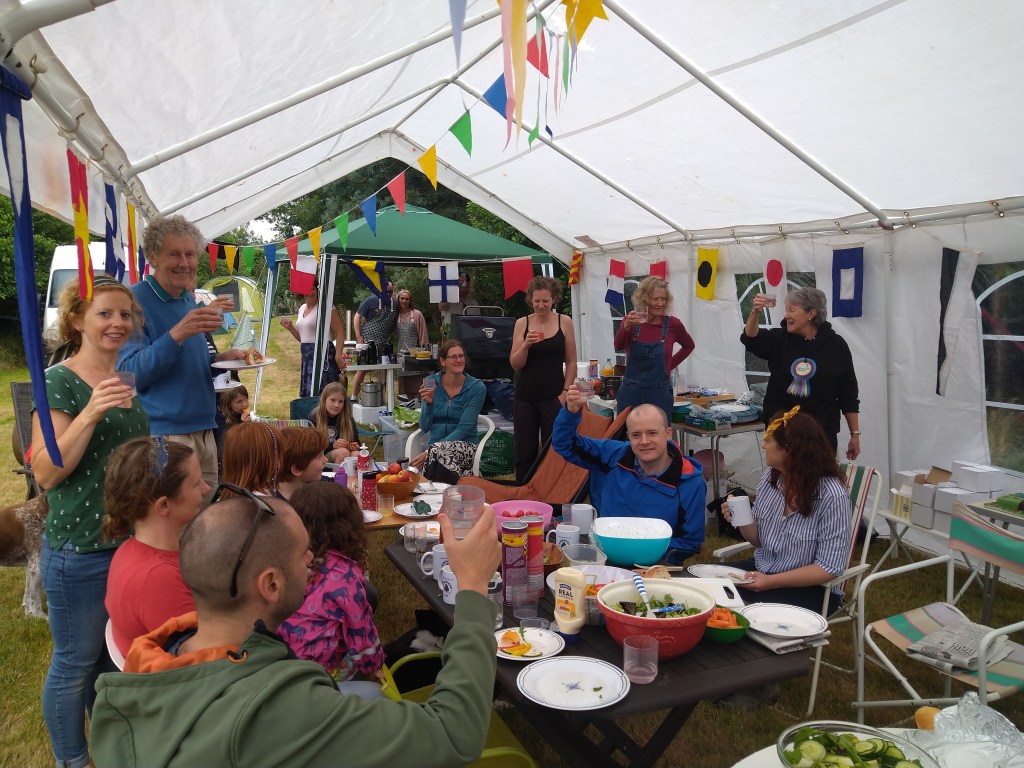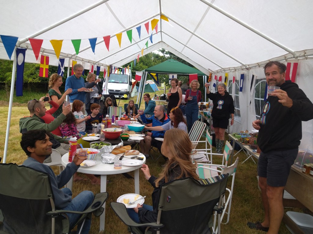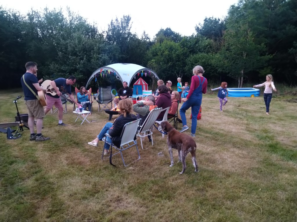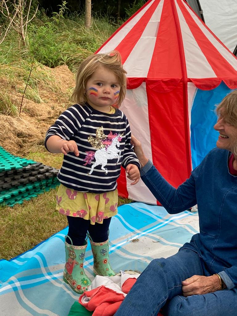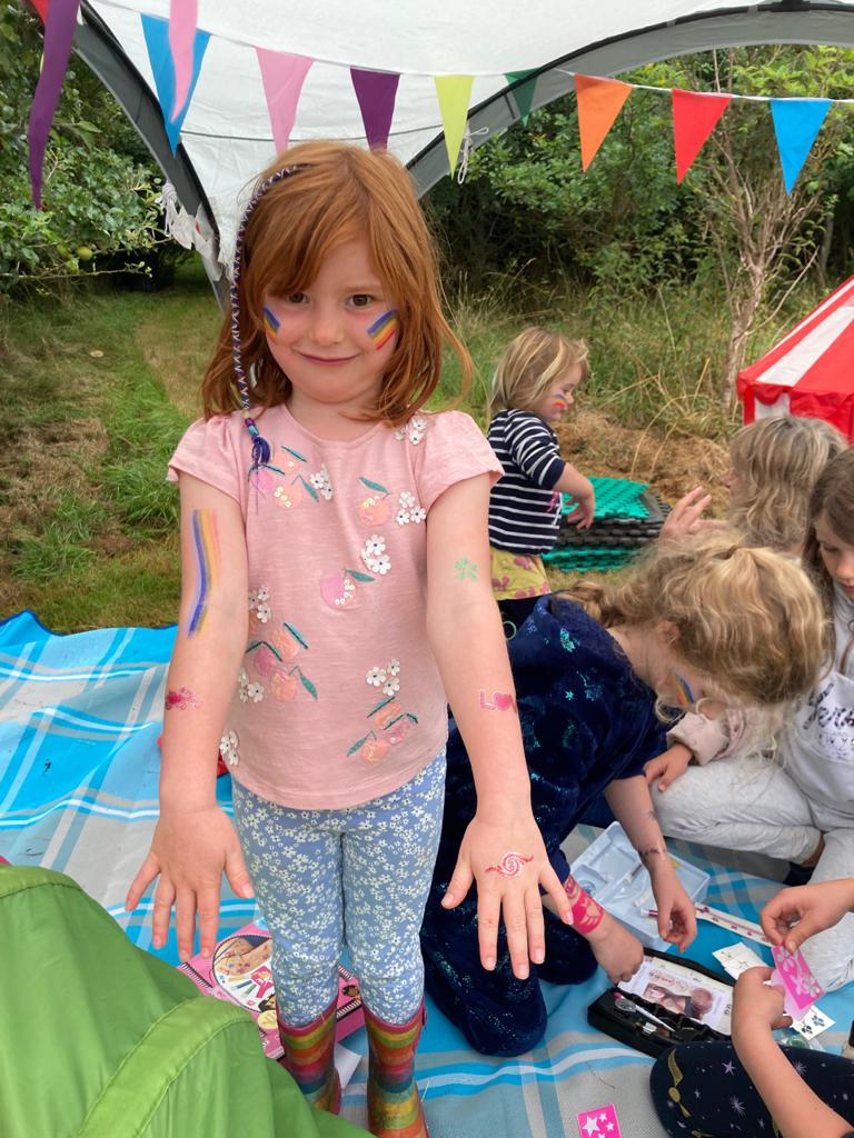 Afternoon tea approached so Evelyn, as judge of the cake competition, bravely sampled each entry declaring Ravi’s to be the most moist, tasty and beautifully decorated. The day concluded with everyone gathered round a fire pit where Evelyn’s sons Alex and Stuart entertained us with their guitars and a medley of songs rehearsed and ‘not so’ – everone joining in to fill in the missing lyrics. Sadly it all had to end. Sunday morning dawned wet and drizzly. Isobel created a very popular beauty parlour for the kids giving the parents space to strike their soggy tents. The girls were returned to their parents looking like they had just arrived back from the Glastonbury Festival covered in tattoos, sparkles and rainbow crayon.
