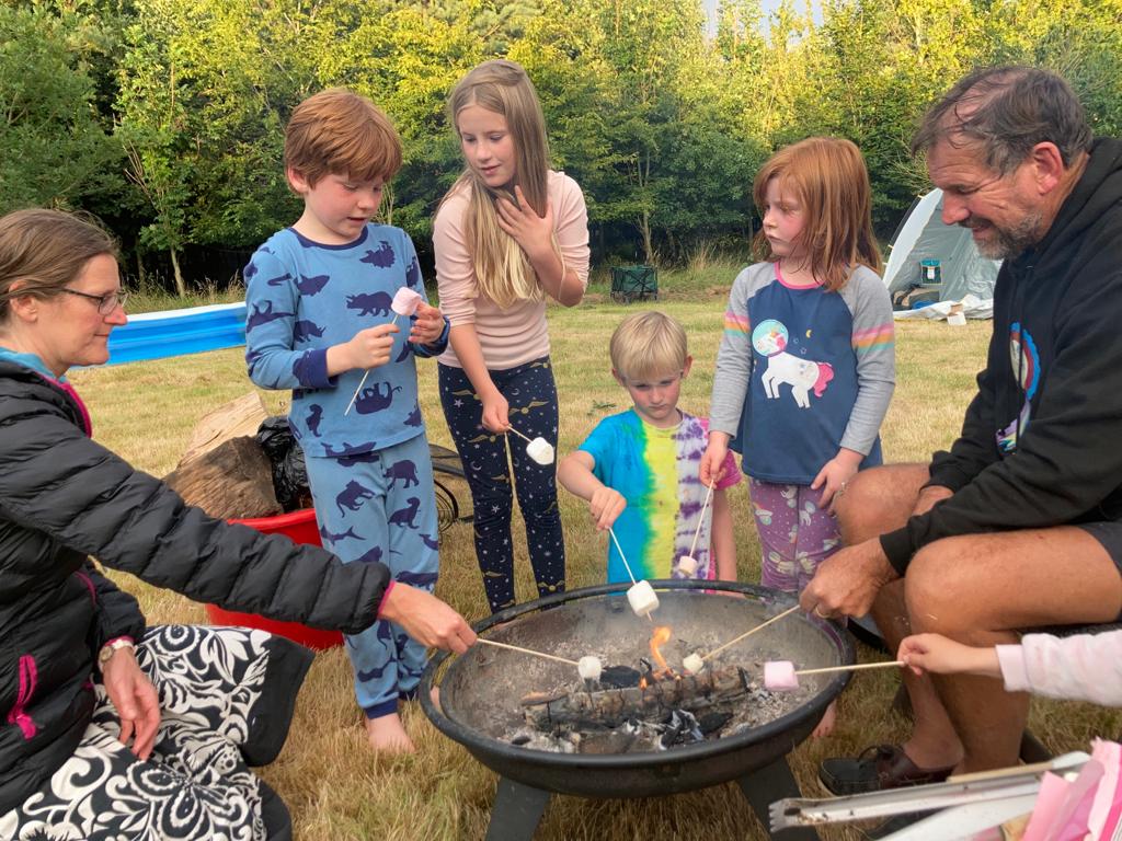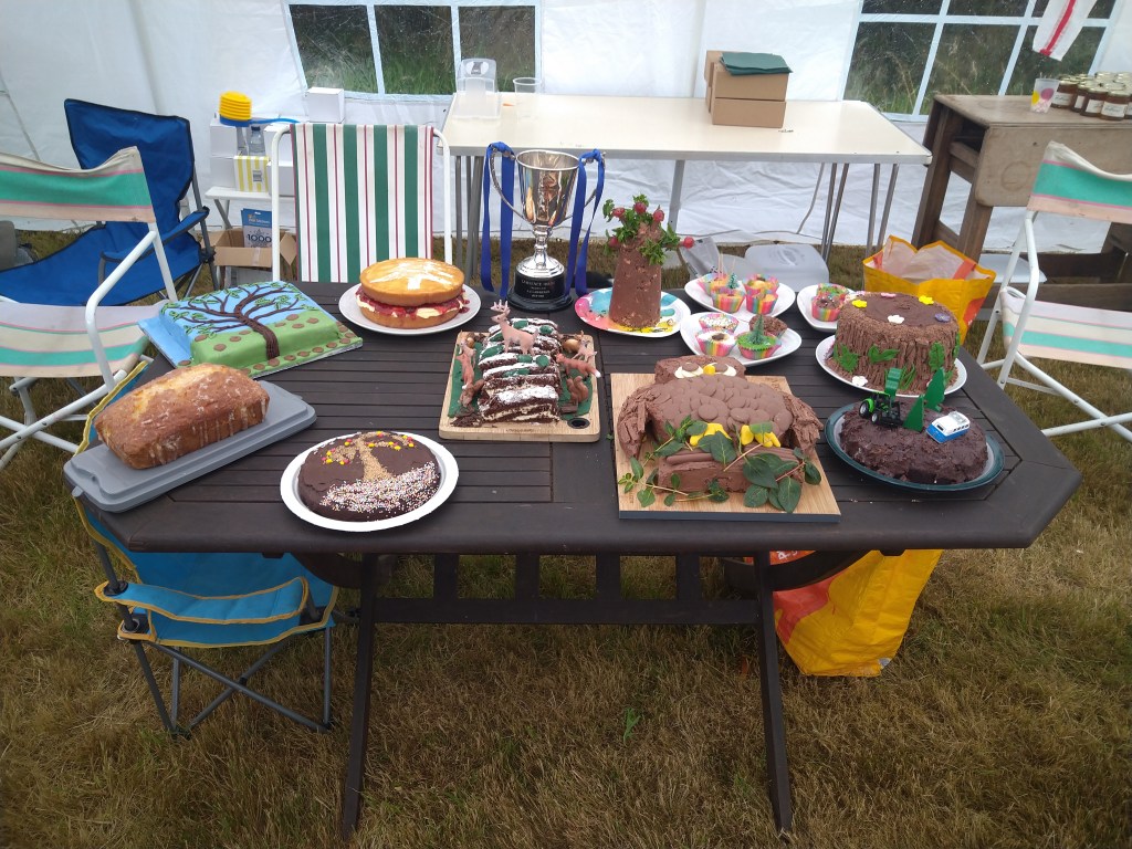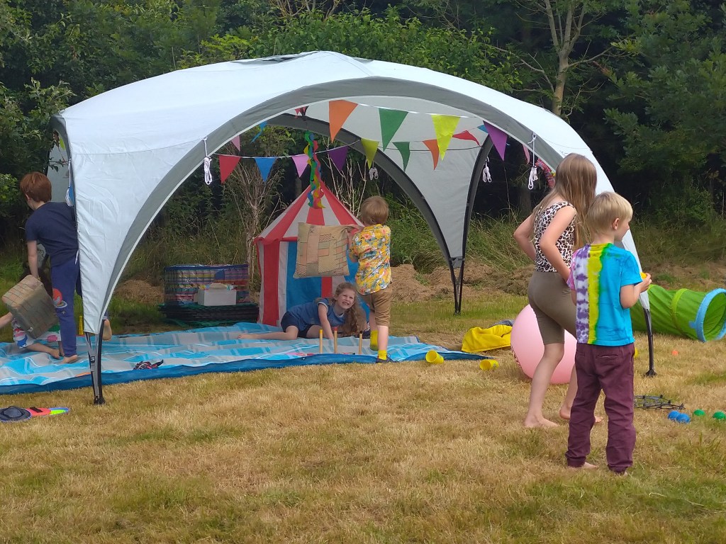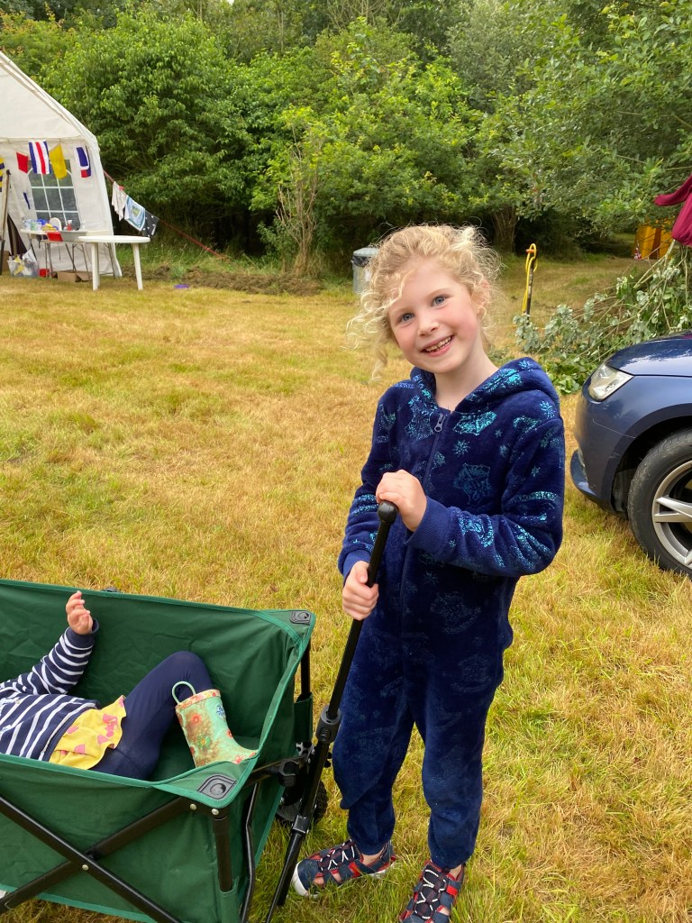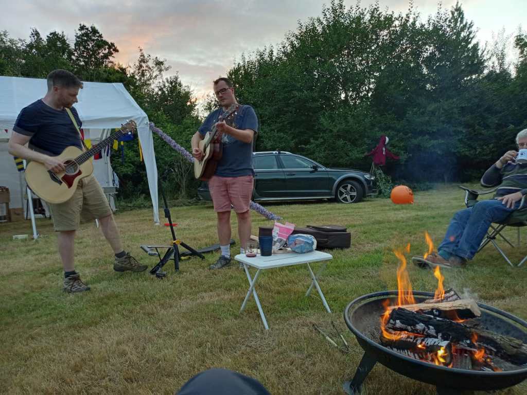 Afternoon tea approached so Evelyn, as judge of the cake competition, bravely sampled each entry declaring Ravi’s to be the most moist, tasty and beautifully decorated. The day concluded with everyone gathered round a fire pit where Evelyn’s sons Alex and Stuart entertained us with their guitars and a medley of songs rehearsed and ‘not so’ – everone joining in to fill in the missing lyrics. Sadly it all had to end. Sunday morning dawned wet and drizzly. Isobel created a very popular beauty parlour for the kids giving the parents space to strike their soggy tents. The girls were returned to their parents looking like they had just arrived back from the Glastonbury Festival covered in tattoos, sparkles and rainbow crayon.