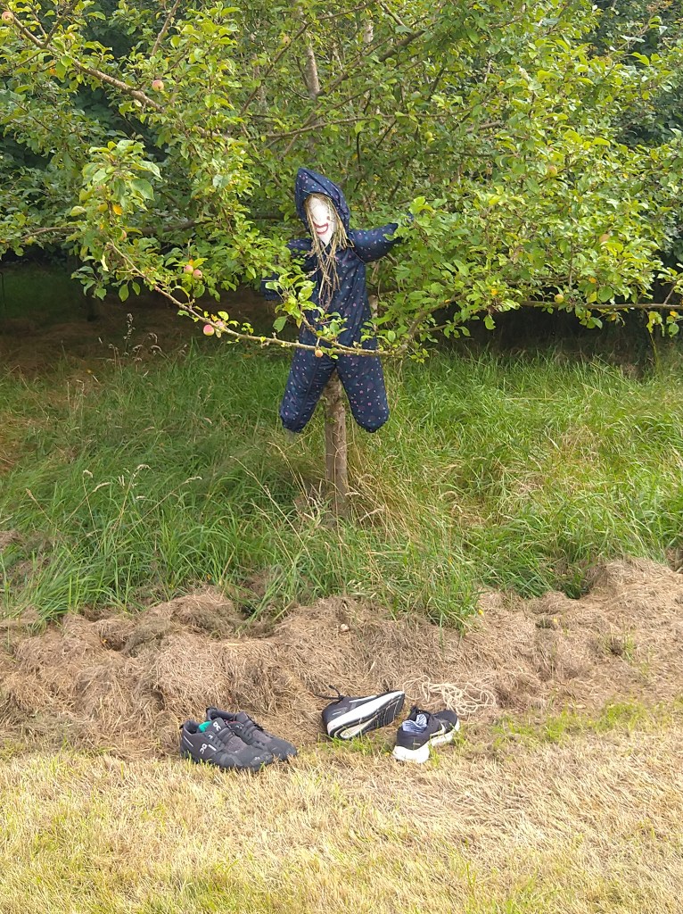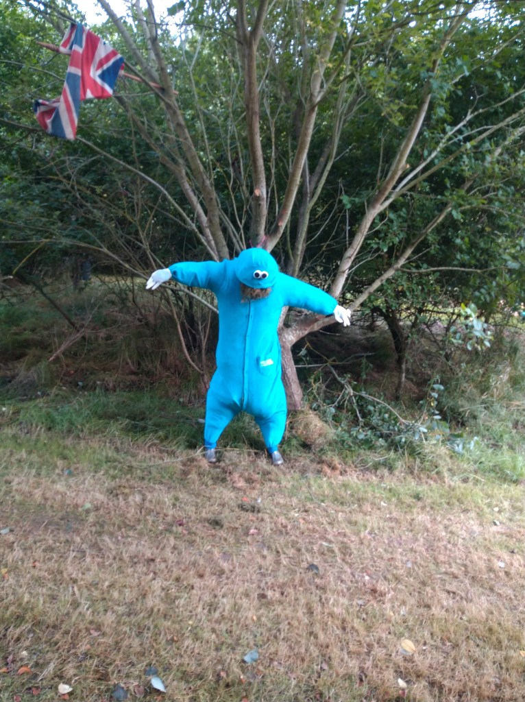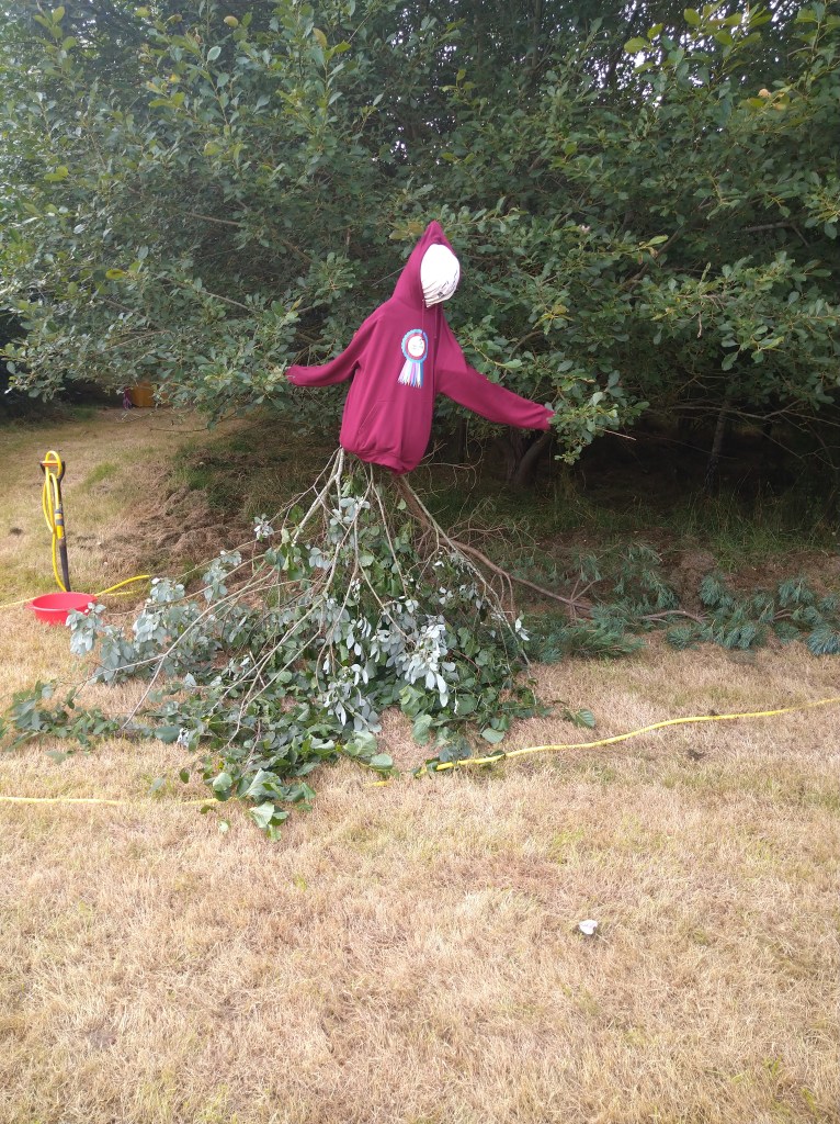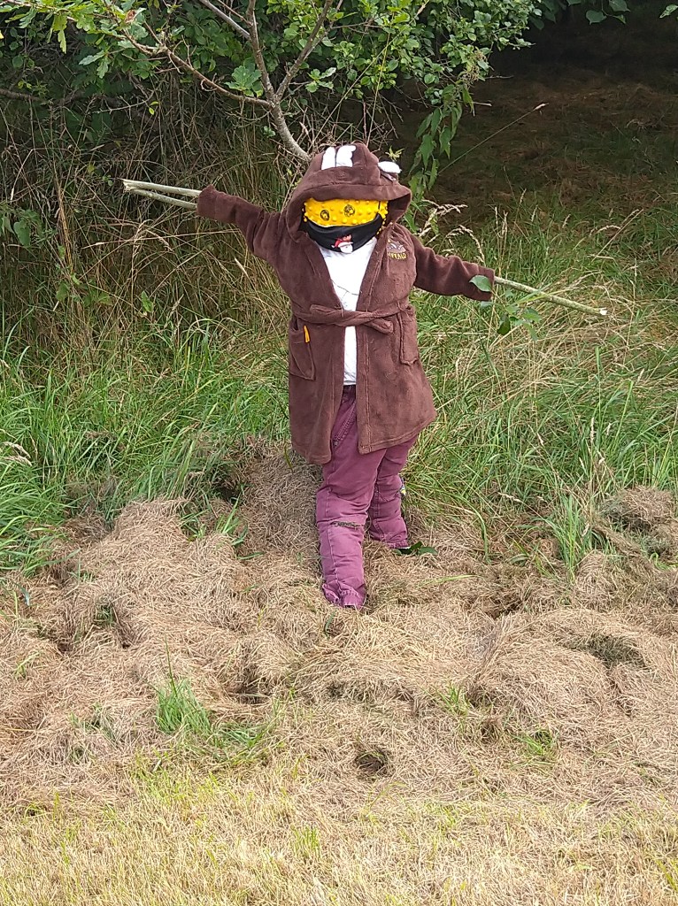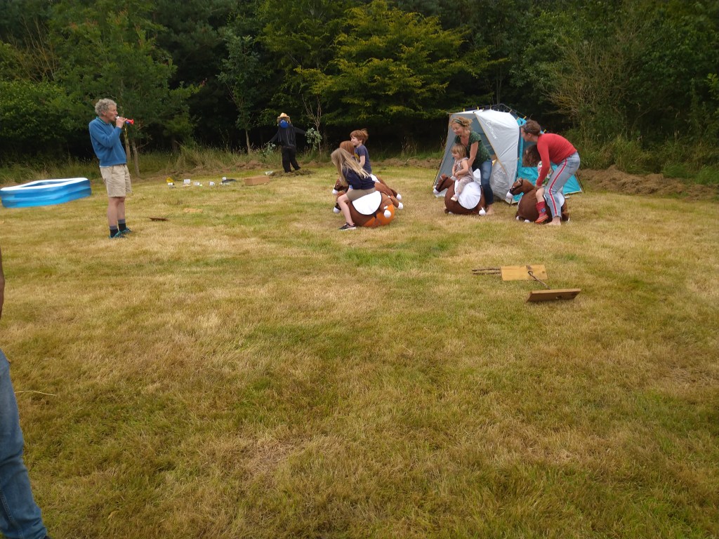 The games kicked off with a scarecrow building competition. The photos attest to the ghoulish nature of the entries. Little people were dispatched on a bug hunt which brought back slugs, snails, ants, spiders, wood lice, toads and Tiana’s winning grasshopper. Space hopper horses galloped round a course of jumps including a water hazard which scuppered some of the front runners. On to the ‘Marshmallow Medley’. Marshmallows big and small were throw, man-handled by chopsticks and finally stuck to our foreheads. The stickiest character turned out to be Adam.